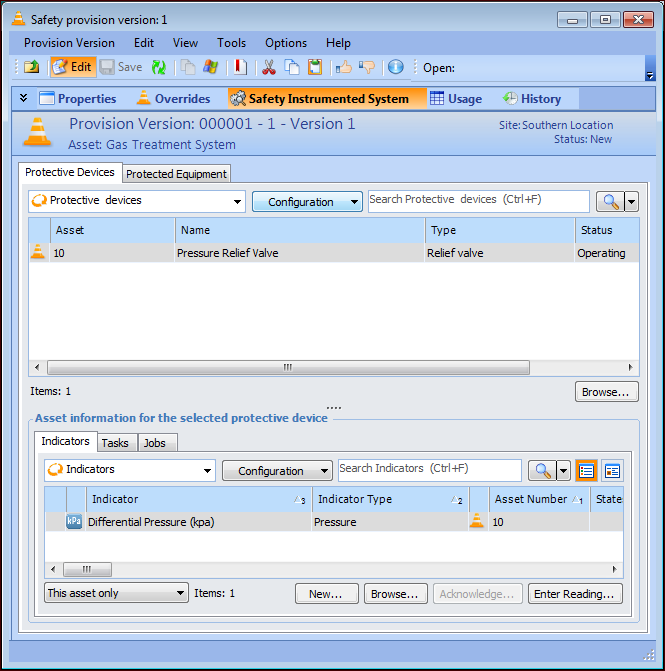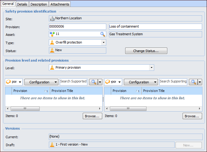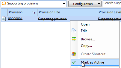 2. Click New. The Safety Provision window appears.Tip: You can also create a provision by opening an asset and selecting the Safety Management view, Provisions tab. Click New. The Safety Provision window appears, and the asset information is filled in.The status describes the provision’s stage of development. It is usually provided by the safety type. For information about changing a status, see step 8.When you select a level, the Supported provisions table, Supporting provisions table, or both appear. Any secondary or supporting provisions that reference the current provision are listed in the table. You can click Browse to select supported or supporting provisions.Tip: If a supported or supporting provision no longer applies to the current provision, mark it as expired. Right-click the provision in the table and click Mark as Expired. The provision is now shown as struck-through.To activate an expired provision, right-click it and click Mark as Active:Tip: Select the History view on the Safety Provision window to see information about actions performed on the provision, its versions, supporting provisions, and supported provisions.