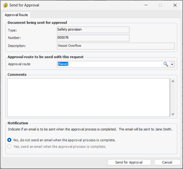 2. Select the Approval Route from the list. Only approval routes that are valid for safety objects are listed.