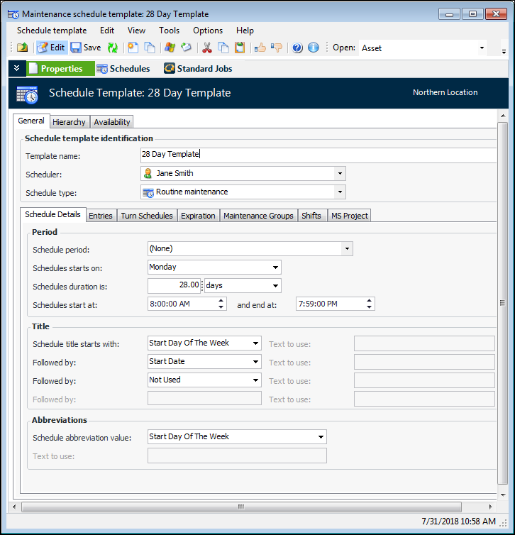5. On the Properties view, Hierarchy tab, right-click the schedule template and select New Child. APM creates and opens a new schedule template. The new template inherits its properties from the parent template. For example: