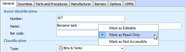 When you are in Security Setup mode, you can directly change the security settings for any attribute or relationship by right-clicking the field that represents that data and selecting the appropriate Mark as option. For example, to change security for the Asset Name attribute, open any asset, select the Properties view, General tab, and right-click the Name field.Note: Secured data may still be accessible in some reports. If this is the case, you will also need to secure the report. See Securing Reports.If you set some attributes or relationships to enabled in a class that has a read-only or not accessible default security level, you must also enable the Check out action in order to allow users to edit those fields.To Secure an Attribute or Relationship