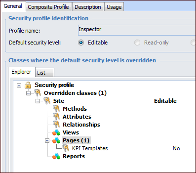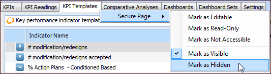 APM enables you to quickly and easily build security profiles by directly setting security levels on items within the user interface (UI), such as menu actions, views, and fields. You can do this by entering the Security Setup mode for a security profile. Click Setup Mode on the General tab of a security profile.For example if you want to hide the site’s KPI Templates page for a profile, you would open the site, select the Analytics view, right-click the KPI Templates tab, and select Secure Page and then Mark as Hidden.Editing a Profile Manually