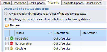 4. Select Only triggered when the asset and site have the following statuses. The asset and site statuses are listed in the table. For example: