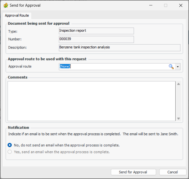 1. From the site’s Inspection Management view, select the Inspection Reports tab. Right-click the report and click Send for Approval. The Send for Approval dialog appears.