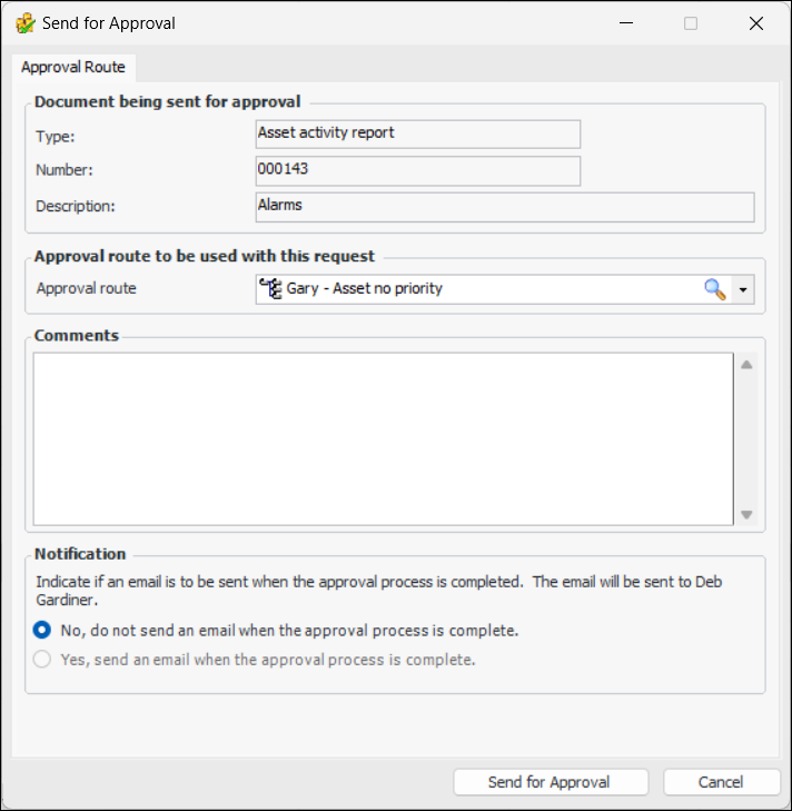 4. When you are finished, click Send for Approval. The asset activity report is sent for approval.