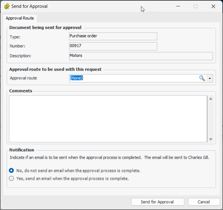 3. Click the Purchase Order menu and then Send for approval. The Send for Approval dialog is displayed.