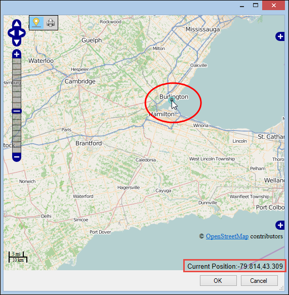 4. Select the Set Locations Mode icon (), and click the location on the map where the object resides. A gray dot appears on the map and its longitude and latitude coordinates appear on the bottom right corner of the map. For example: