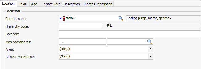 1. Open the object for which you want to set map coordinates. For example, you can open an asset’s Properties view, General tab, Location tab: