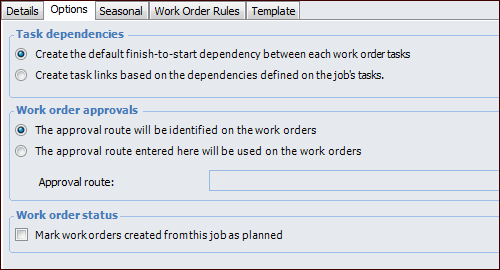 For each standard job, you can set options and rules that control the behavior of the work orders created from the job. This includes approval and scheduling options and rules for whether or not users are allowed to modify the work orders created from the job.To Set the Job’s Work Order Options and Rules