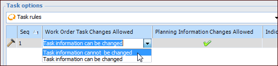10. The Task options table lists the job’s tasks. For each task, the current rule is shown for whether information can be changed when the work order task is generated for the standard job. If you wish to change the rule, press F2. The task’s rule is open for editing:
