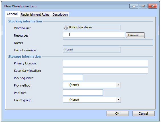 2. On the Warehouses tab, double-click the warehouse in which the resource will be stocked. The Warehouse window appears.
