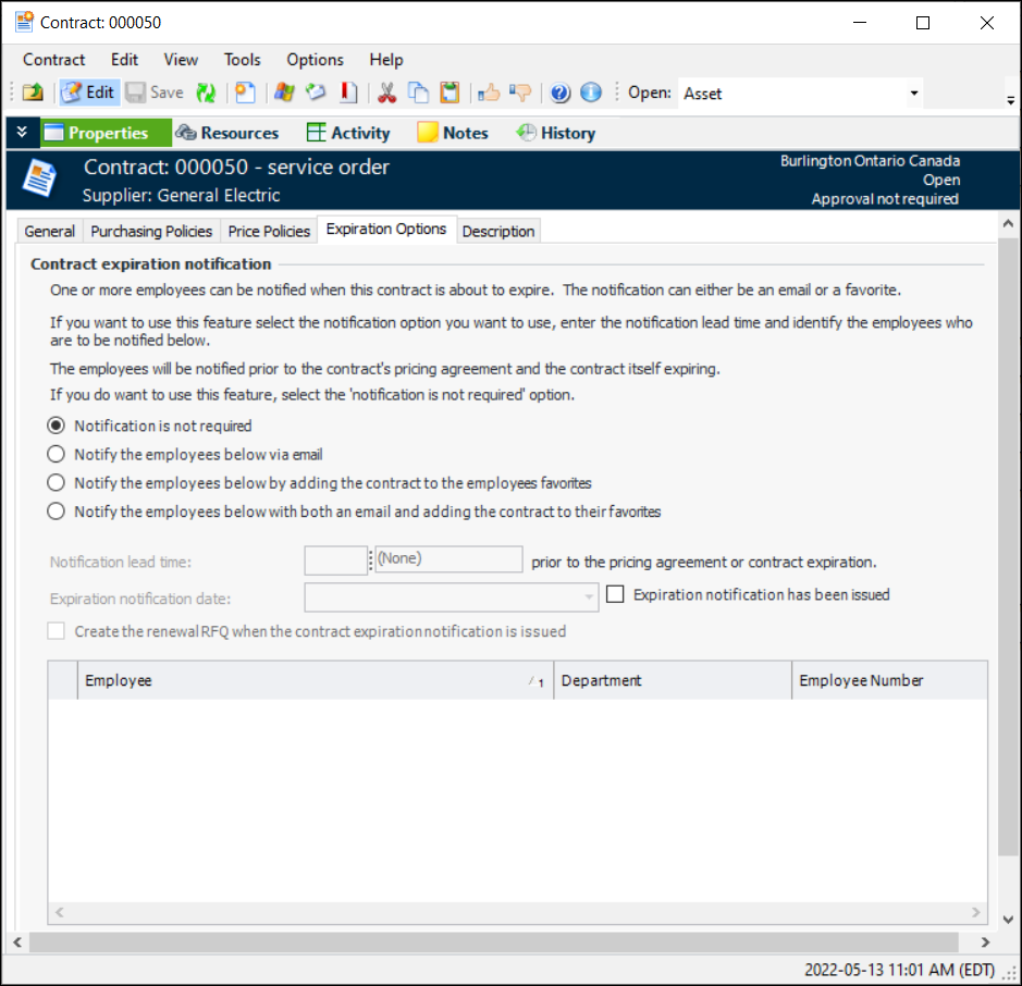 Note: In order for notification and expiry to work, the Check for Expiring Contracts method must be run on a regular basis. Your system administrator can schedule this method for the site. You can also run the method manually from the site’s Tools menu. To schedule this method, please see Creating a Scheduled Action.To Set Expiry Notification Rules on a Contract