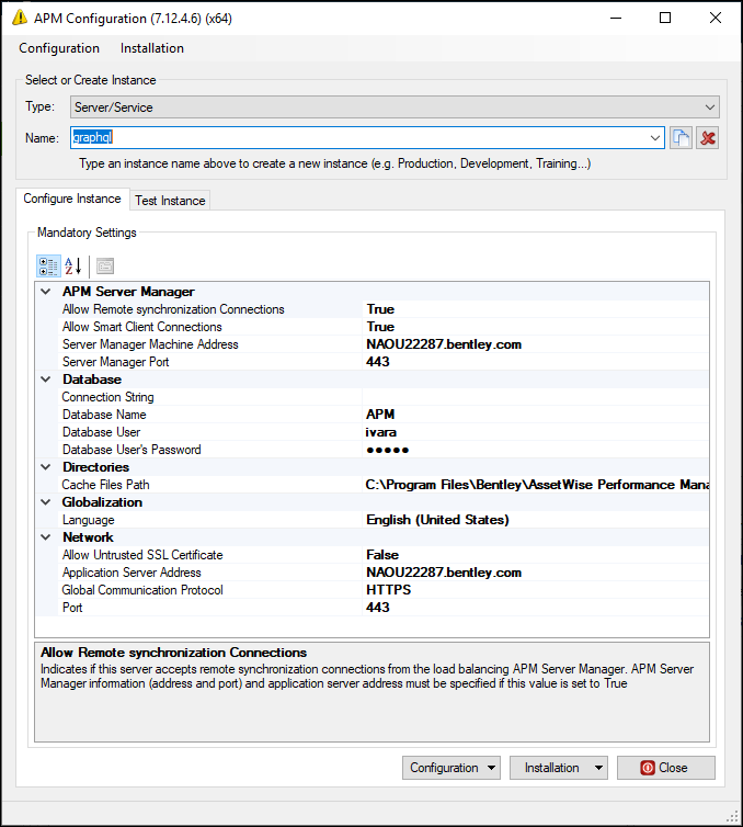 1. Launch APM Configuration. For example, on the Start menu, click Bentley, and then Configure APM. The APM Configuration window appears.