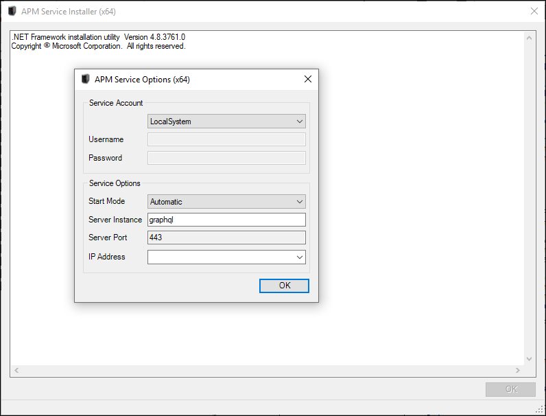 1. In the APM Configuration window, Configure Instance tab, click the Installation list and then Install Service. The APM Service Options dialog appears. The APM Service Installer window also appears to show the status of the installation as it progresses: