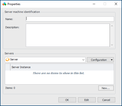 2. Click New to create a server machine. The Server Machine Properties dialog appears. For example: