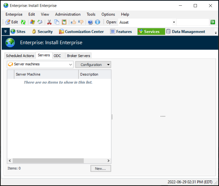 1. From the Enterprise window, select the Services view and the Servers tab. This example shows the tab before a server machine has been set up: