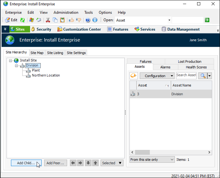 1. Tip: You can also add child or peer sites at any location in the hierarchy by selecting the Site Hierarchy tab, selecting the site, and clicking Add Child or Add Peer. Use the arrow buttons to move sites in the hierarchy. For example: