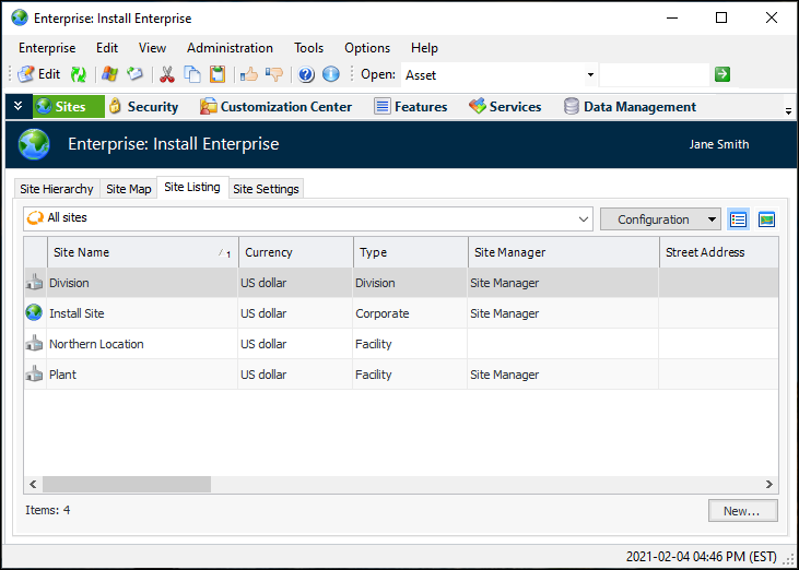 You should define your sites at the levels you use to partition your data. For example, if you want to view a cost summary of two separate operating locations, define a higher-level site in which to capture the consolidated costs. If you wish to share certain objects (for example, templates), they need to be owned at a higher-level site.To Add Sites to Your Site Hierarchy