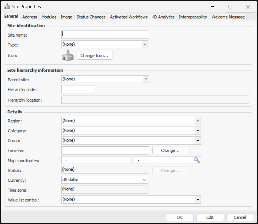 Tip: To quickly create a site type, click in the Type box and press F3. The Site Type window appears, where you can define a type.