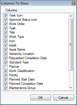 2. Right-click the column heading and click Show. The Columns to Show dialog appears, listing all of the columns available in the table configuration.