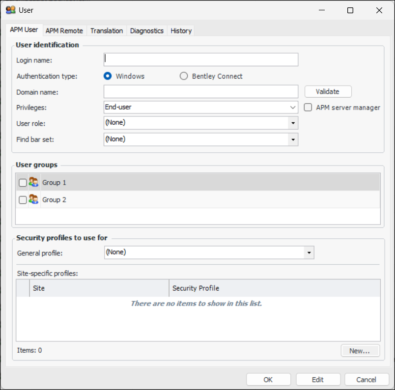 • Administrator: This privilege is used by APM administrators and personnel who need to customize the software, create custom reports, activate CMMS integration, or set up and assign security profiles. Users with this privilege can perform Customer-level customizations, create shareable table configurations, work with purging rules, and use the Security Setup mode.When Windows authentication is in use, you can enter the domain name for the user and click the Validate button to confirm the domain. If you leave the domain name blank, the software will attempt to select the correct domain when the user logs on.To Create an APM User ID