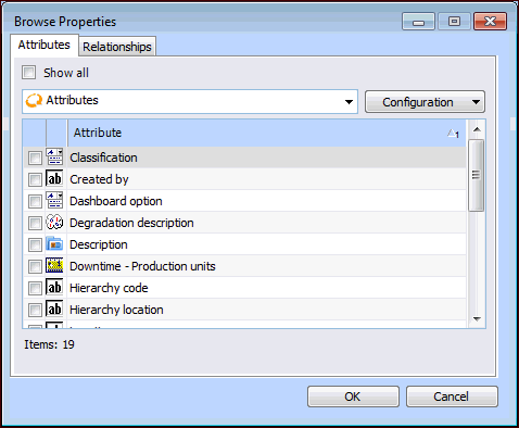 1. In the Assets, Employees, Trades and Resources, Maintenance Groups, or Failure Modes tab, click Browse. The Browse Properties dialog appears. Here is an example for the Asset class.