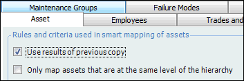 The copy function for failure modes includes smart asset mapping, which uses information about the source assets to identify matching assets in the target asset structure. Using the Copy Failure Modes wizard, you can select source and target asset structures, the failure modes to copy, and the criteria for identifying target assets. You can then confirm or change the matches that the system suggests. When you click Process, the wizard performs the copy and reports the results.You can define smart mapping settings at the site level to provide default values in the Copy Failure Mode wizard. When a copy request is initiated, the site-level settings are copied to the wizard. For example, if you select the Use results of previous copy option for assets, the Options dialog in the wizard shows the option selected by default:To Set Smart Mapping Defaults