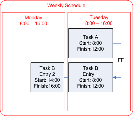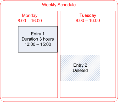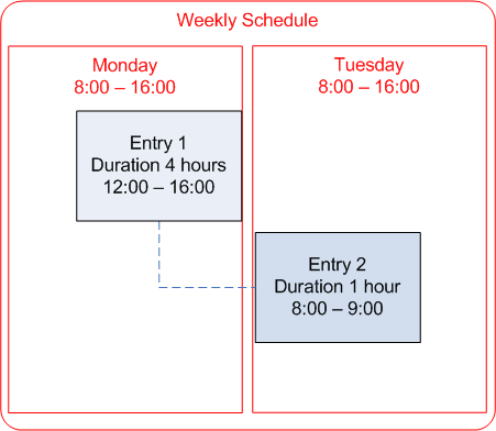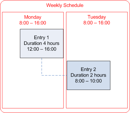 If you have a task that spans two or more schedules or shifts, you can split the schedule entry. When you add a long task to a schedule, the system may automatically split the task into multiple linked entries (called “splits”). For example, if the task extends over two days, the system may create one entry for the Monday schedule and one entry for the Tuesday schedule. To do this, you must select the Entries respect shift and date boundaries option in the schedule’s properties.Example