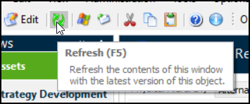 The following table describes the common tool bar buttons. Equivalent menu commands and shortcuts are also shown. This example shows the tool bar in the Asset window:Tip: When you hover your mouse pointer over a tool bar button or menu option, APM also displays a tool tip for the menu command, for example: