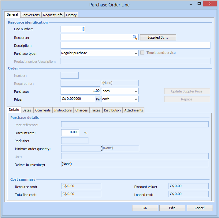 5. Click OK. The line is added to the purchase order. The cost is based on the rental rate on the supplier resource for the resource.