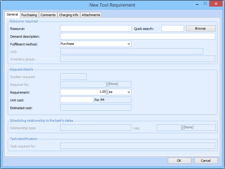 12. On the Purchasing tab, browse to enter the Supplier. The cost is based on the rental rate on the supplier resource for the resource.