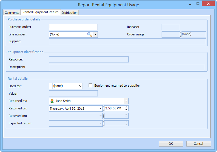 3. On the Rented Equipment Return tab, enter the following information: