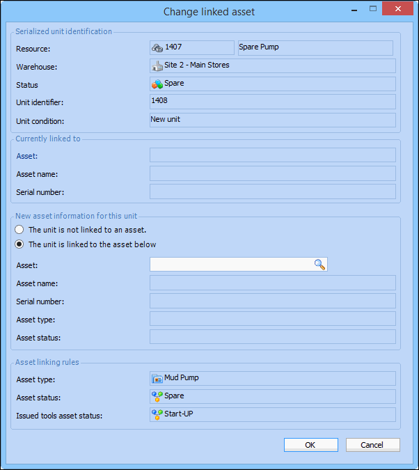 The asset to which the serialized unit is linked. Browse to select an asset, and then click OK. Only assets of a type that can be linked to this resource and with an asset status that matches the unit status are listed.