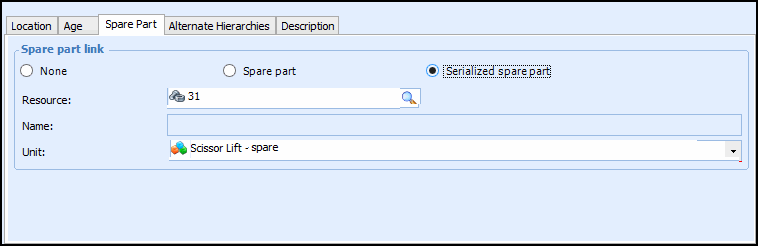 To link the asset to a serialized resource unit, select Serialized spare part.