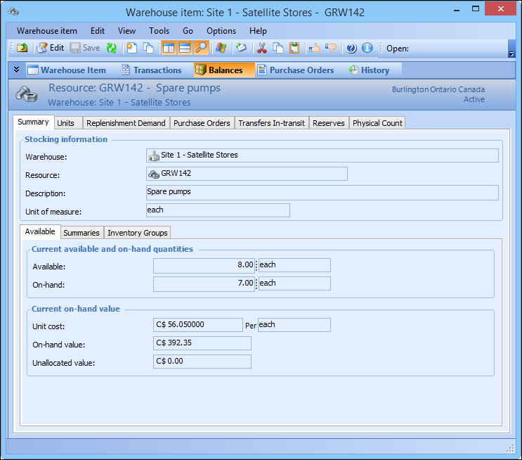 5. Select the Summary tab, and then the Available tab to view current available and on-hand quantities as well as current on-hand values.