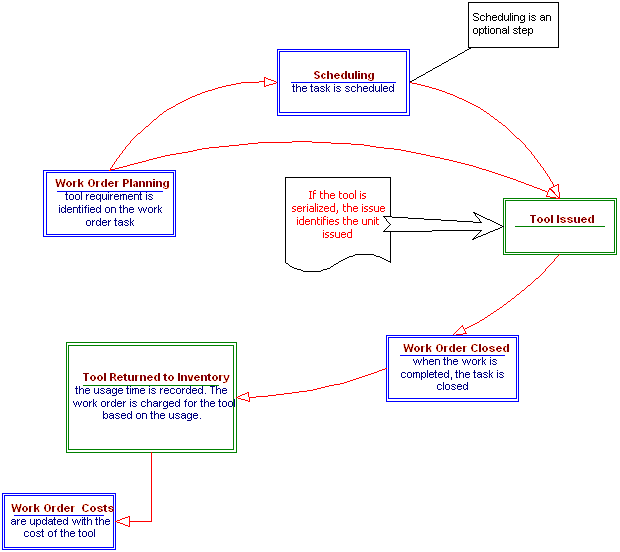 Tasks Settings Tools Usage and Equipment Rental Using APM’s serialized inventory support for tools, in addition to tracking inventory balances, you can track information about the individual resource units. You can uniquely identify each unit of the serialized resource, and track the usage costs for tools and rental equipment. Tools serialized inventory support can be used with large tools such as cranes, forklifts, and trucks, and with small tools like welding apparatus, calibration devices, and electric tools. Using APM’s tools serialized inventory support, you can link a maintainable asset to a tool resource unit to track usage on assets such as a cranes or forklifts. The topics in this section explain APM’s serialized resource settings, the tool usage cycle, and the rental process. What is a Tool Resource? A tool is an instrument that is used in the completion of a maintenance task. The tool is not “consumed” by the work order. It is used and then returned to inventory to be used by another job. Tools can be special hand tools, calibration devices, vibration analysis tools, and other predictive maintenance measuring devices. Equipment such as cars, trucks, and cranes can also be defined as tools if the equipment is required to complete maintenance work. You can track the usage costs for tool resources by defining a usage cost for a period of time. Costs of tool usage can be charged to a work order or asset. When a transaction for tool issue or usage crosses sites that use different currencies, the cost of the tool is charged in the currency of the site that uses the tool. You can create a separate warehouse and maintain an inventory of tools, for example, in a tool crib or a garage. The Tool Usage Cycle The tool usage cycle consists of the following steps. This cycle is repeated each time a tool is used: • The need for a tool is identified as a work order task requirement or requisition line. • The work order is scheduled (optional). • The tool is issued from the warehouse. • When the work is complete, the tool is returned to the warehouse and usage is reported. The work order task is charged based on the amount of time the tool was used. When a transaction for tool issue or usage crosses sites that use different currencies, the cost of the tool is charged in the currency of the site that uses the tool. What is Rental Equipment? Equipment rentals are basically tools rented from a supplier. They can be instruments, hand tools, or any equipment that is rented from a supplier to assist in the completion of a work order. A supplier must be set up to supply the rental equipment. At the end of the job, the equipment is returned to the supplier. The cost of the equipment is based on a hourly/daily/weekly rental rate. The Equipment Rental Process The equipment rental cycle consists of the following steps: • The need for the tool is identified as a requirement on a work order task. • A purchase order is created. The purchase order is identified as a rental type order. • The work order task is scheduled (optional). • The equipment is received from the supplier. • When the work is complete, the equipment is returned to the supplier and the work order task is charged based on the time the equipment was rented.