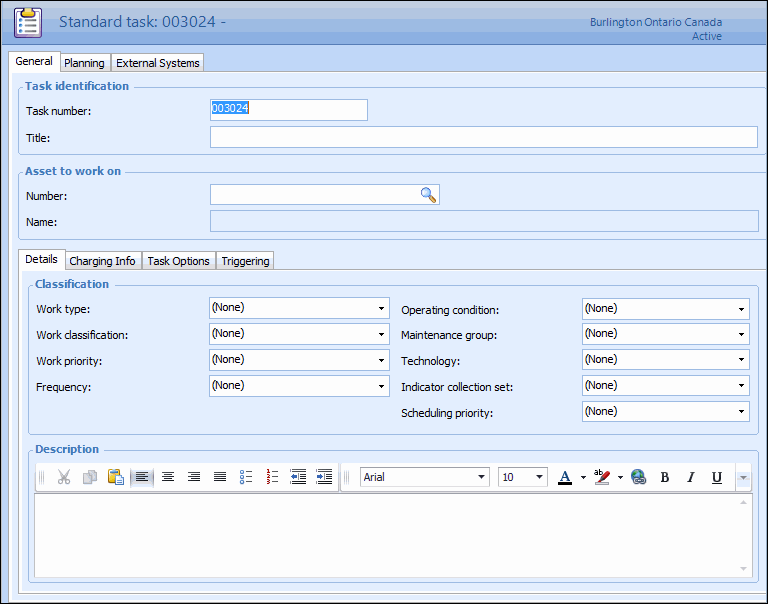 9. For standard tasks, if the asset that will be charged is different from the asset that is being worked on, select the Charging Info tab and browse to select an asset in the Asset to charge box and then click OK.
