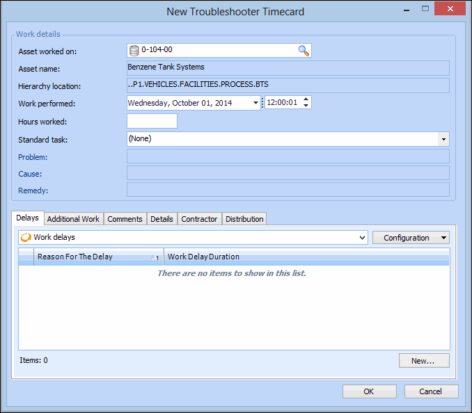 5. If there were any delays in completing the work, click New. The New Troubleshooter Timecard dialog appears. For example: