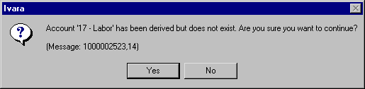 •“Account [derived account number] has been derived but does not exist. Are you sure you want to continue?”