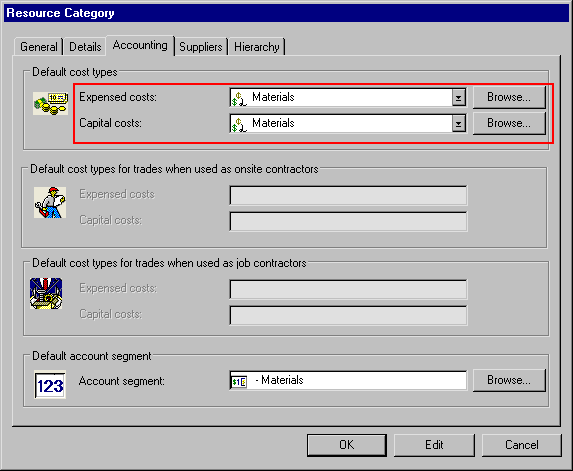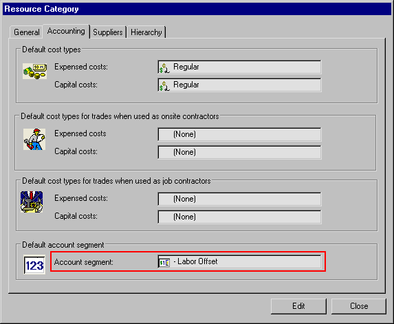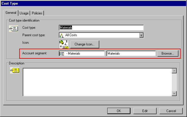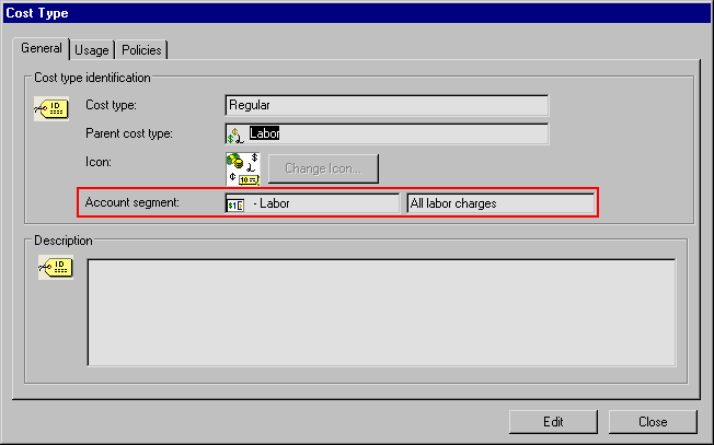 4. This tab shows the default cost types for the resource category. If the transaction is an expensed cost, double-click the cost type icon in the Expensed costs box. If the transaction is a capital cost, double-click the cost type icon in the Capital costs box. The Cost Type dialog appears.The account segment shown on the General tab is the segment being used in the derivation.Cost Type Account Segment for Labor (Timecards)