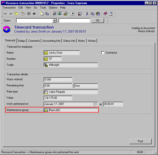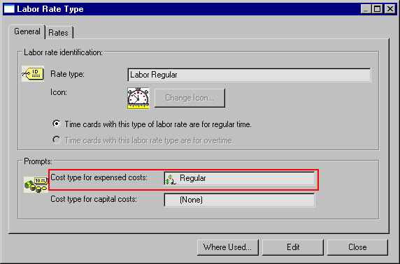 3. The General tab shows the default cost types for the labor rate type. If the transaction is an expensed cost, double-click the cost type icon in the Expensed costs box. If the transaction is a capital cost, double-click the cost type icon in the Capital costs box. The Cost Type dialog appears.The account segment shown on the General tab is the segment being used in the derivation.Maintenance Group Account Segment