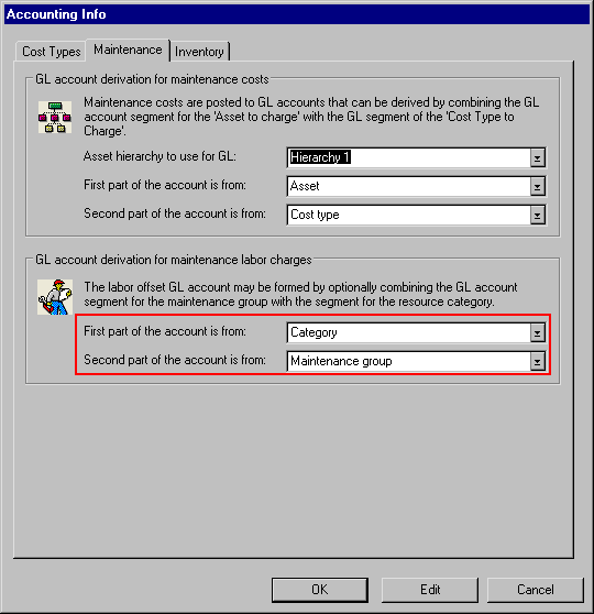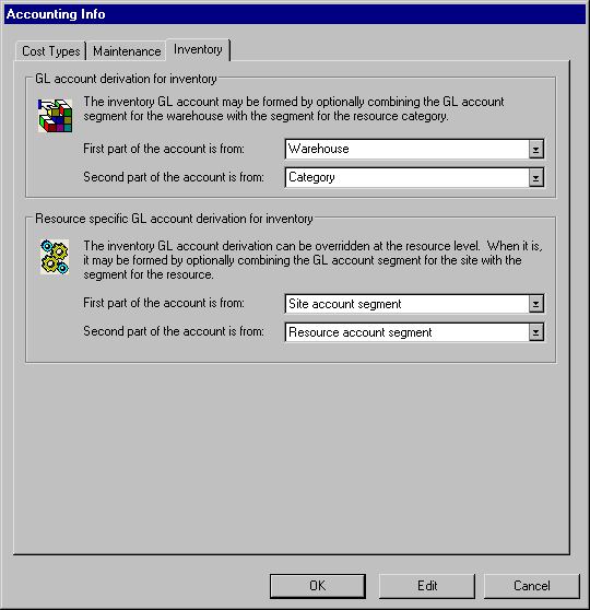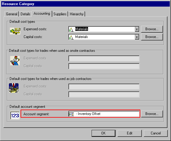2. The account segment used in the derivation is in the Inventory account (segment) box.Resource Category Segment (for Inventory Offset Accounts)