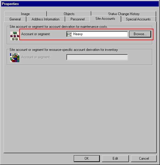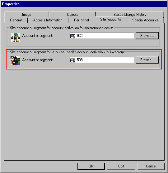 2. Select the Site Accounts tab. The account segment used in the offset account derivation is in the Site account or segment for resource-specific account derivation for inventory box.Resource Account Segment (for Resource-Specific Offset Accounts)