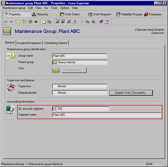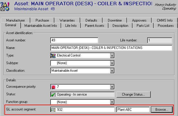 The asset’s segment is set on the asset being charged (Properties view, General tab). However, if that asset does not have a segment, the system looks up the asset hierarchy for a parent asset with an account segment.If none of the ancestor assets have an segment, the site’s segment is used (site Properties dialog, Site Accounts tab).Cost Type Account Segment for Materials, Tools, and Services