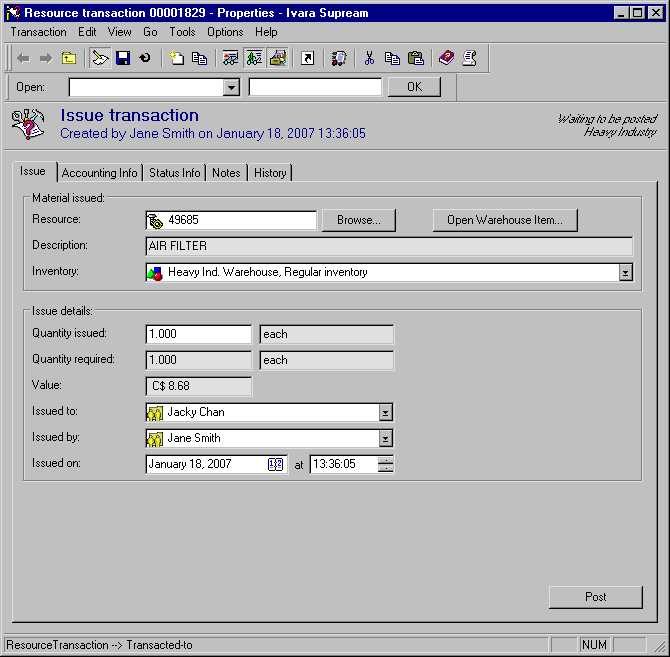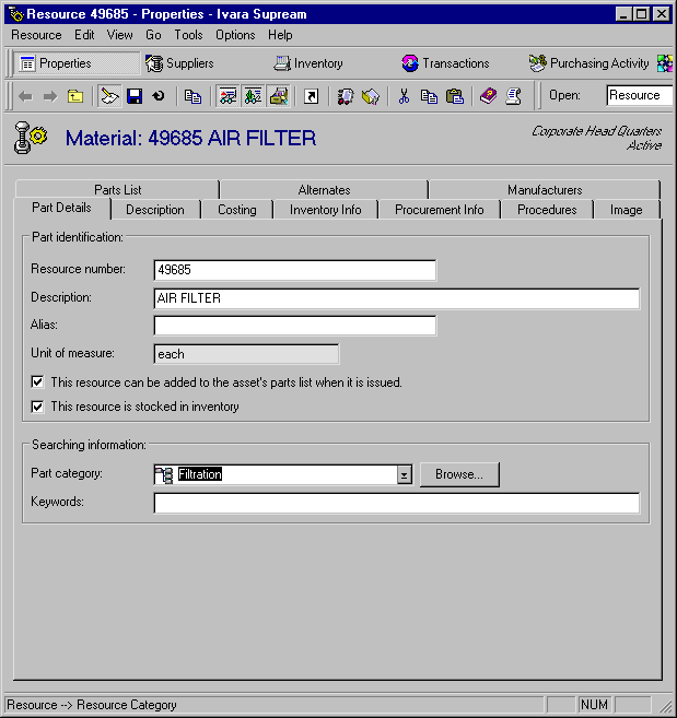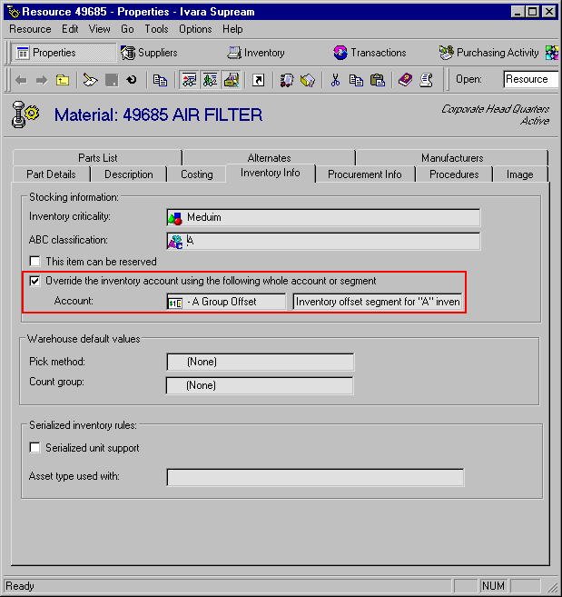 2. Select the Inventory Info tab. If the resource has an account override, the segment being used in the derivation is shown in the Account box.