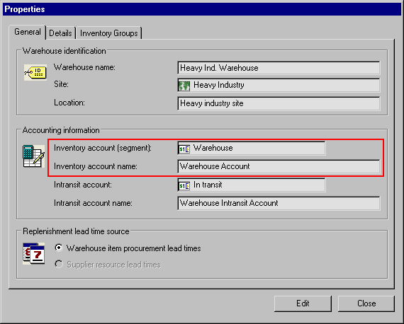 3. Select the Accounting tab. The segment used in the offset account is shown in the Default account segment box.Warehouse Account Segment (for Inventory Offset Accounts)