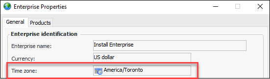 Properties. The Enterprise Properties dialog displays the time zone that was selected when the database was initialized. For example: