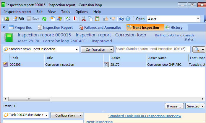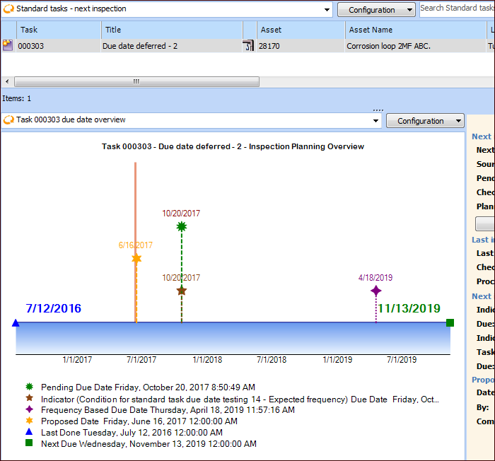 1. In the Next Inspection view, select the standard task in the top table, click the Selected list, and click Propose Due Date. The Propose Task Next Due Date dialog displays information about the standard task, including its indicators and their collection information.
