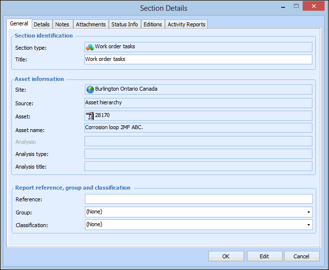 4. On the General tab, you can view the section identification, asset information, and report reference, group, and classification for the section.