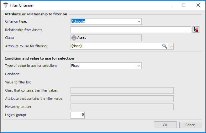 • Fixed: Select this option to filter a group of items based on a specific value that you enter.For example, if you are filtering a group of assets to list only maintainable assets, you would select the Asset class’s Classification attribute, and set Maintainable as the fixed value.
