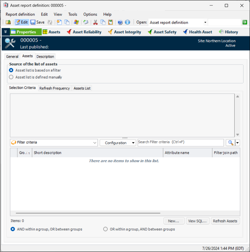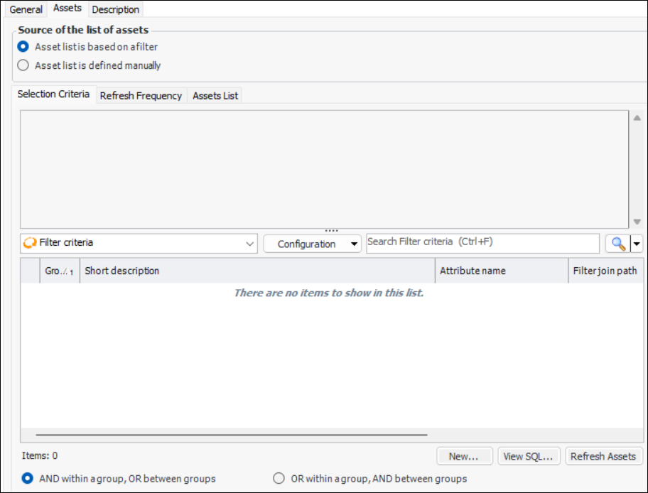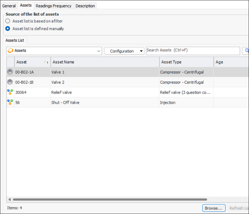 5. Click Refresh Assets. Select the Assets List tab to see the results of the filter. You can also view the list in the Assets view.Note that you can select the Refresh Frequency tab to have the list refreshed automatically based on a recurrence pattern.To Work With the Comparison